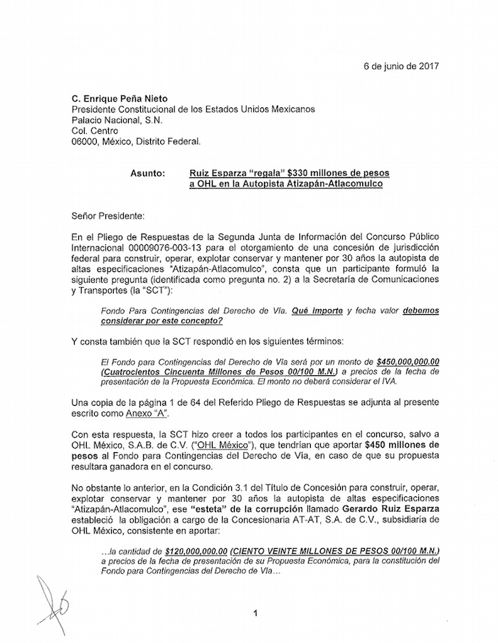 Sin embargo, “en el Título de Concesión que firmó con OHL esa obligación se redujo a sólo 120 millones de pesos. En otras palabras: SCT engañó al resto de los competidores, eliminando o afectando sustancialmente la competencia, y un par de meses después Ruiz Esparza graciosamente le regaló 330 millones. En el Título de Concesión se establece que si ese monto resulta insuficiente, la SCT asume la obligación de cubrir la diferencia”.