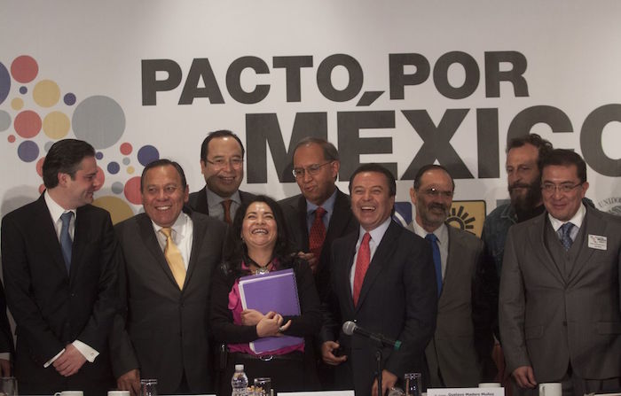 El Pacto por México fue firmado el 2 de diciembre en el Castillo de Chapultepec de la Ciudad de México por el Presidente de la República, Enrique Peña Nieto; Gustavo Madero Muñoz, entonces presidente del Partido Acción Nacional; Cristina Díaz Salazar, en esos momentos dirigente interina del Partido Revolucionario Institucional y Jesús Zambrano Grijalva, presidente del Partido de la Revolución Democrática. Avanzados los trabajos, se sumó Arturo Escobar, quien era presidente del Partido Verde Ecologista de México.El 7 de enero del año siguiente fue presentado el Consejo Rector. En ese cuerpo estaban el ex Gobernador José Murat, quien fue nombrado coordinador ejecutivo y a la postre, escribió el libro “Pacto por México, de la Reforma Política de 1977 a la construcción de acuerdos”; Felipe Solís Acero, quien era el subsecretario de Enlace Legislativo, así como el entonces Secretario de Hacienda y Crédito Público, Luis Videgaray Caso.
