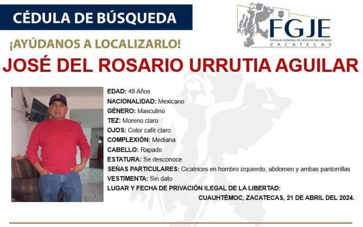 El profesor José del Rosario Urrutia fue plagiado durante la madrugada del domingo en el municipio de Cuauhtémoc en Zacatecas.