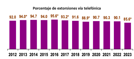 Durante 2023 se cometieron 4.9 millones de delitos de extorsión, lo cual representa una tasa de 5,213 extorsiones por cada 100,000 habitantes. En 85.6 % de los casos, la extorsión fue telefónica y fue pagada en 12.9 % de las ocasiones, de acuerdo con la Encuesta Nacional de Victimización y Percepción sobre Seguridad Pública (ENVIPE) 2024.