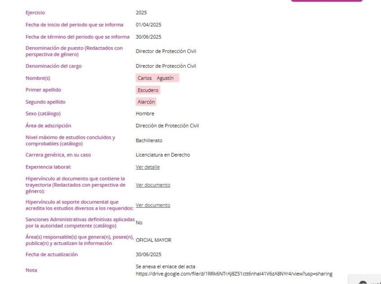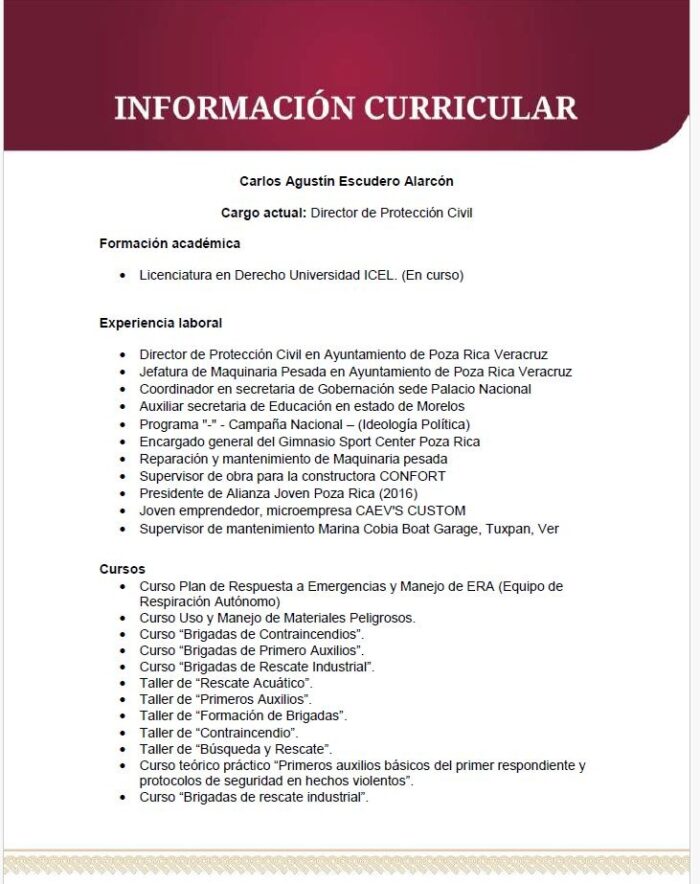 El director de Protección Civil en Poza Rica, Veracruz, Carlos Agustín Escudero Alarcón, es estudiante de derecho y, de acuerdo con la Plataforma Nacional de Transparencia, su nivel máximo de estudios comprobables es el bachillerato.