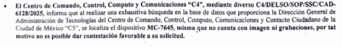 Asimismo, en otra solicitud a parte, realizada a la Secretaría de Seguridad Ciudadana capitalina, se menciona que en el dispositivo MC-7645 de Santa Marta, parte del C5, “no cuenta con imagen ni grabaciones, por tal motivo no es posible dar contestación favorable a su solicitud”.