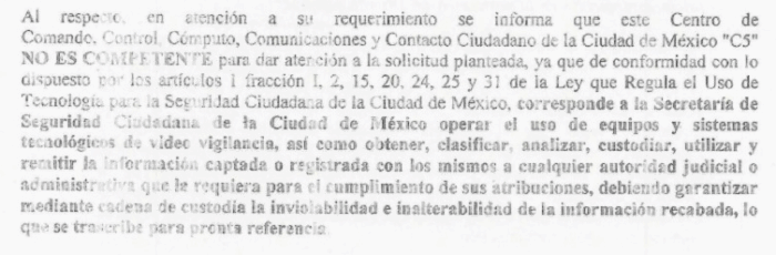 “Al respecto en atención a su requerimiento se informa que este Centro de Comando, Control, Cómputo, Comunicaciones y Contacto Ciudadano de la Ciudad de México ‘C5’ NO ES COMPETENTE para dar atención a la solicitud planteada (…) corresponde a la Secretaría de Seguridad Ciudadana de la Ciudad de México operar el uso de equipos y sistemas tecnológicos de video vigilancia, así como obtener, clasificar, analizar, custodiar, utilizar y remitir información captada o registrada con los mismos a cualquier autoridad judicial o administrativa”.
