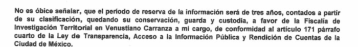 “No es óbice señalar, que el período de reserva de la información será de tres años, contados a partir de su clasificación, quedando su conservación, guarda y custodia, a favor de la Fiscalía de Investigación Territorial en Venustiano Carranza a mi cargo, de conformidad al artículo 171 párrafo cuatro de la Ley de Transparencia, Acceso a la Información Pública y Rendición de Cuentas de la Ciudad de México”, menciona el oficio CGIT/CA/300/2748-2/2025-09 de la Fiscalía General de Justicia de la Ciudad de México, a cargo de Alcalde Luján.