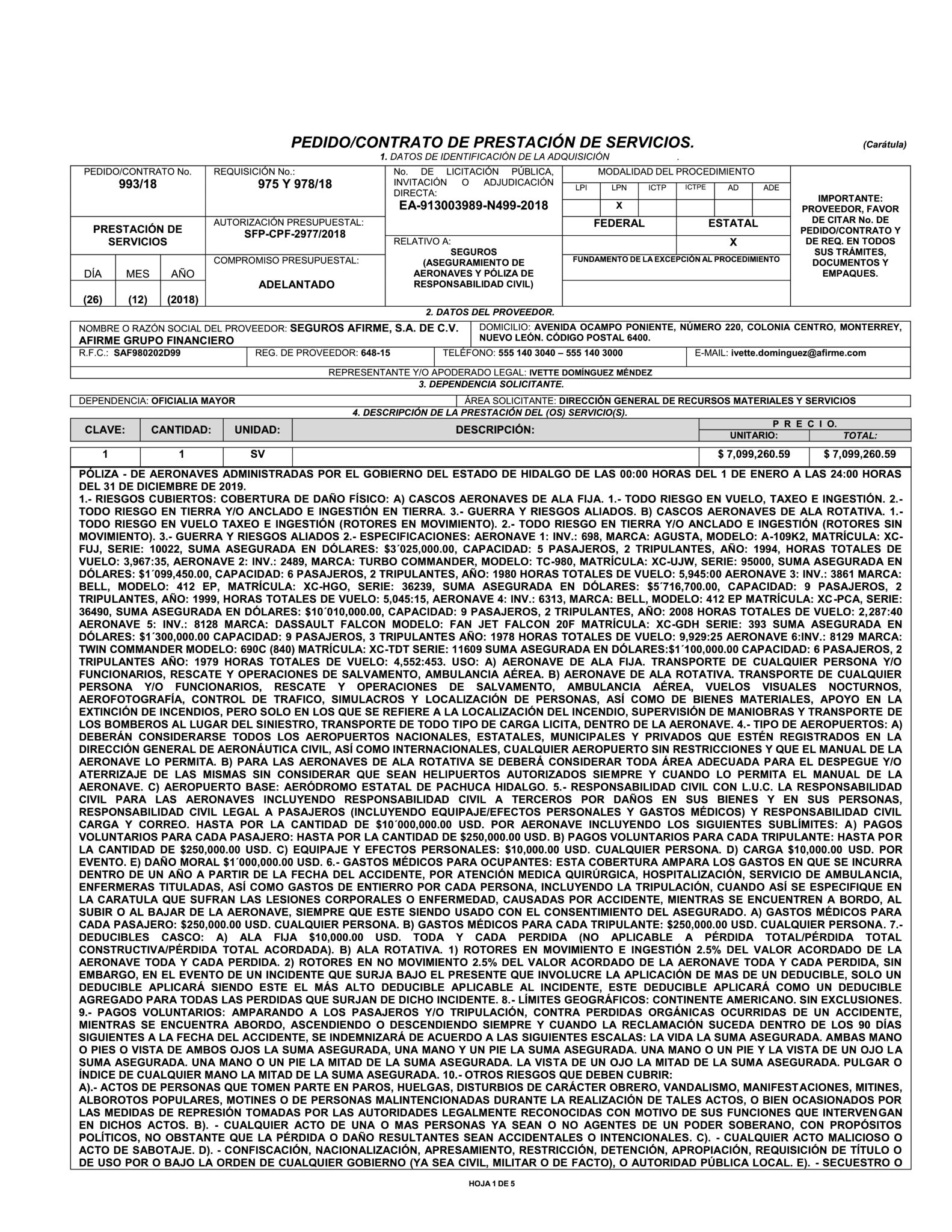 El primer contrato firmado por el gobierno de Omar Fayad data del primero de febrero de 2017 (7M/17), con General de Seguros S.A.B. Fue por 741 mil 214.48 pesos para proteger, durante lo que restaba del año y hasta el 28 de febrero de 2018, de tentativas afectaciones a cinco aeronaves que el Poder Ejecutivo estatal tenía bajo resguardo.