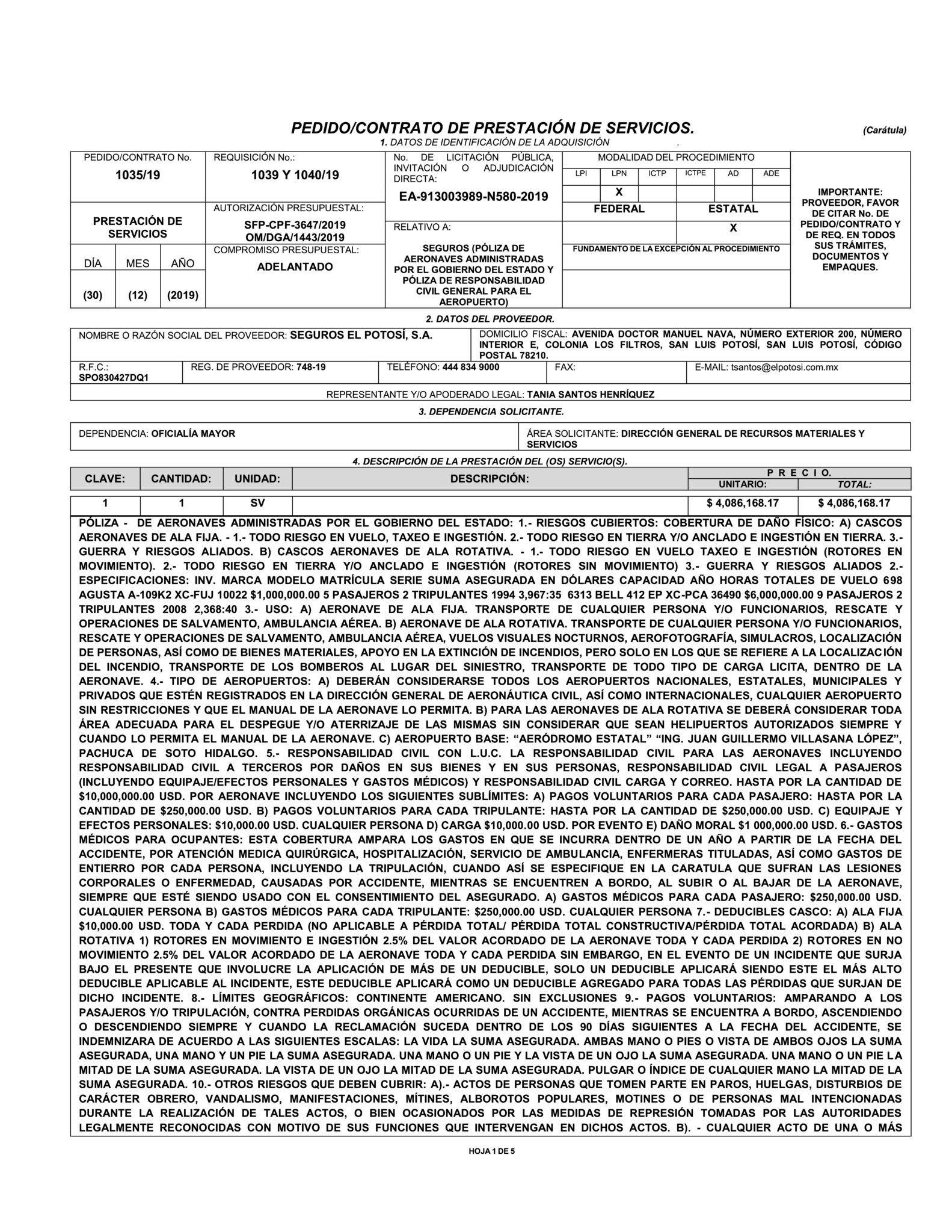 Para el 30 de diciembre de 2019, la Oficialía Mayor firmó un nuevo contrato, el 1035/19: “Póliza de aeronaves administradas por el gobierno del estado y póliza de responsabilidad civil general para el aeropuerto (Guillermo Villasana)”, para la cobertura durante 2020, pero ahora con la empresa Seguros El Potosí S.A.