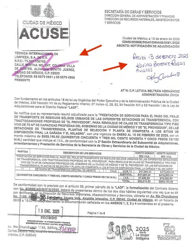 A TÉCNICA INTERNACIONAL EN LIMPIEZA se le entregó la notificación de adjudicación a través del oficio CDMX/SOBSE/DGAF/DRMAS/0081/2025 por 553 mil 195 pesos para la “PRESTACIÓN DE SERVICIOS PARA EL PAGO DEL PEAJE DE TRANSPORTE DE RESIDUOS SÓLIDOS URBANOS DE LA DIFERENTES ESTACIONES DE TRANSFERENCIA, CON TRACTOCAMIONES PROPIEDAD DEL PRESTADOR DEL SERVICIO, PARA REMOLQUE DE CAJAS DE TRANSFERENCIA TIPO PISO VIVO DE 70 M3 DE CAPACIDAD, PROPIEDAD DEL GOBIERNO DE LA CIUDAD DE MÉXICO Y DEL PRESTADOR DEL SERVICIO, A LOS SITIOS DE DISPOSICIÓN FINAL CAÑADA Y MILAGRO”.