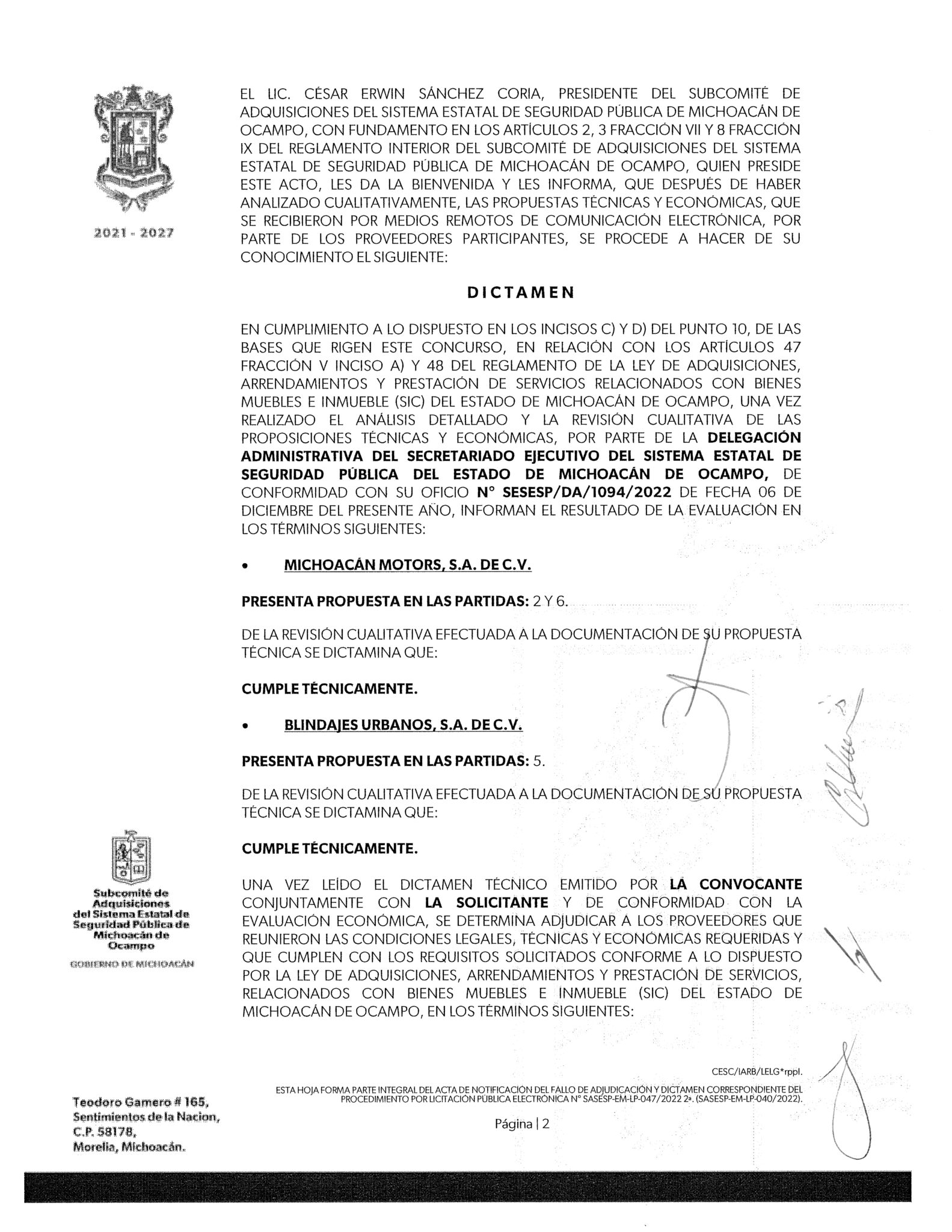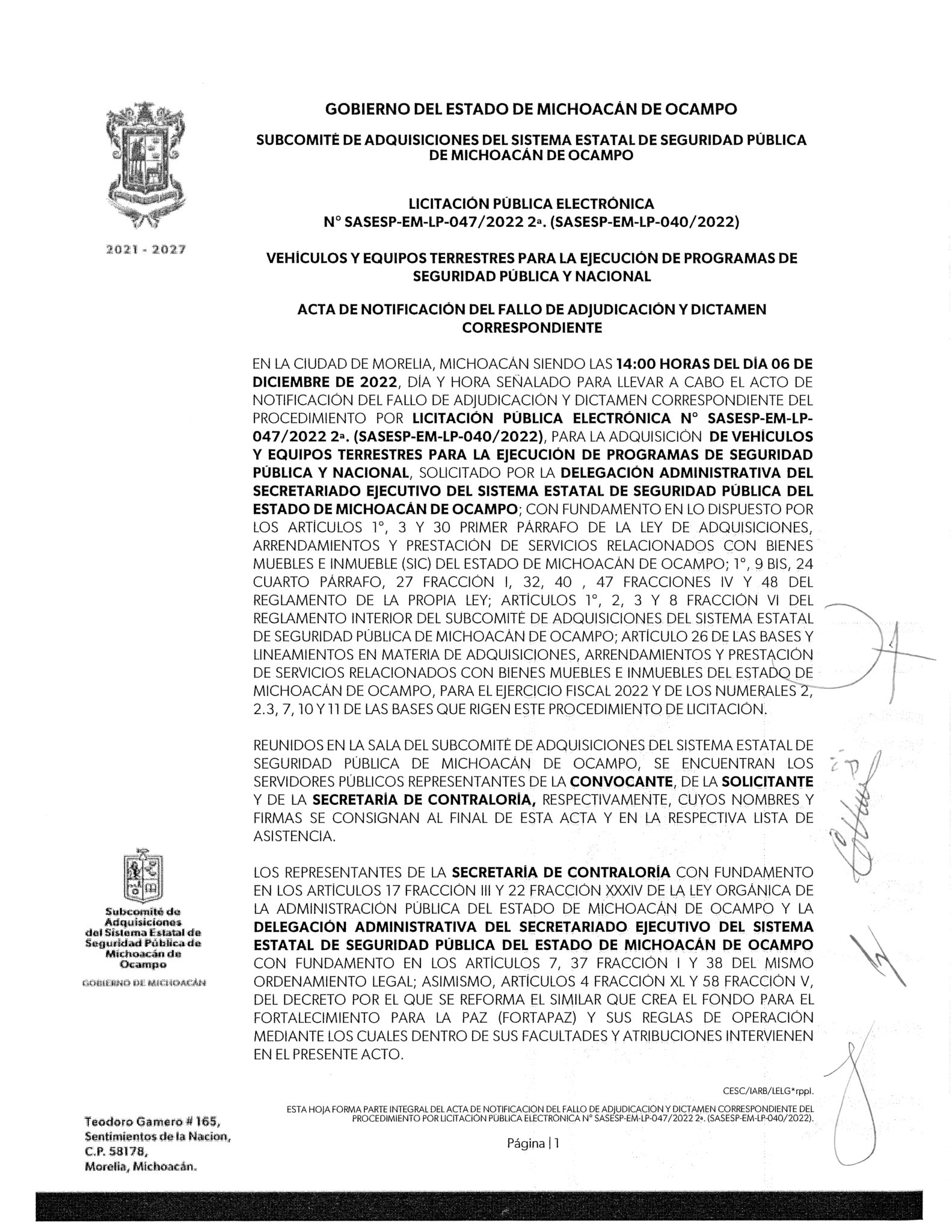 Se emitió el Acta de Notificación del Fallo de Adjudicación y Dictamen para la Licitación Pública Electrónica N° SASESP-EM-LP-047/2022 2ª, en la que la empresa Blindajes Urbanos, del empresario Francisco Arturo Ávila Rosas, padre del legislador morenista, fue designada como ganadora del contrato. El acto se celebró en Morelia, Michoacán, el 6 de diciembre de 2022.