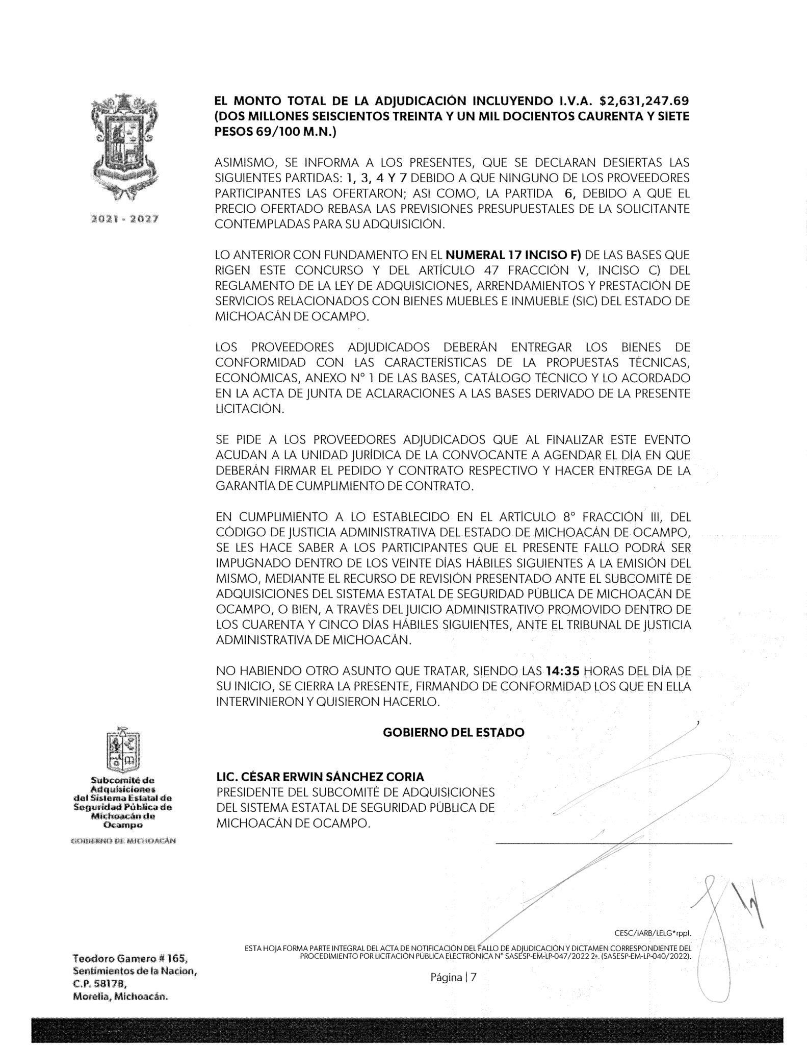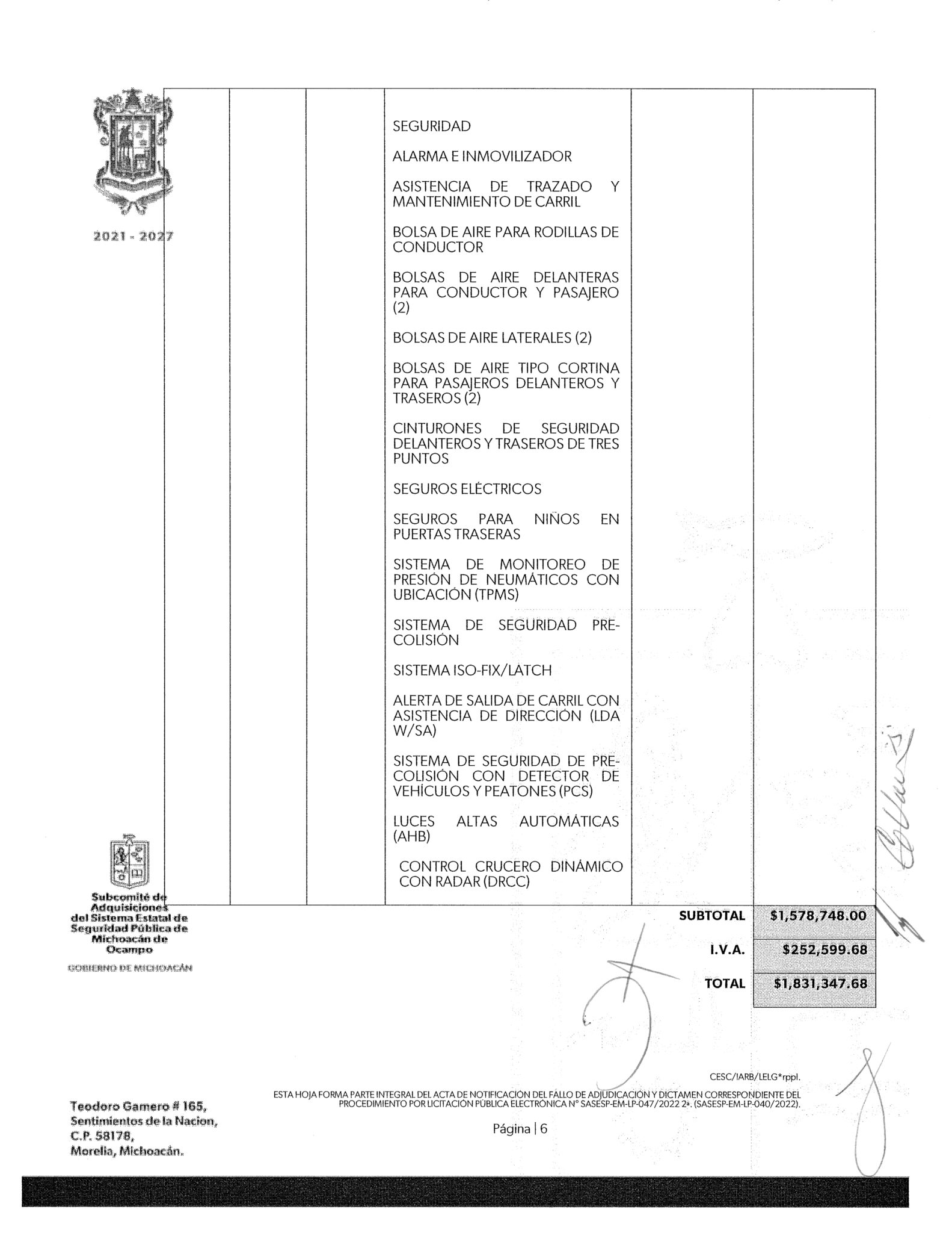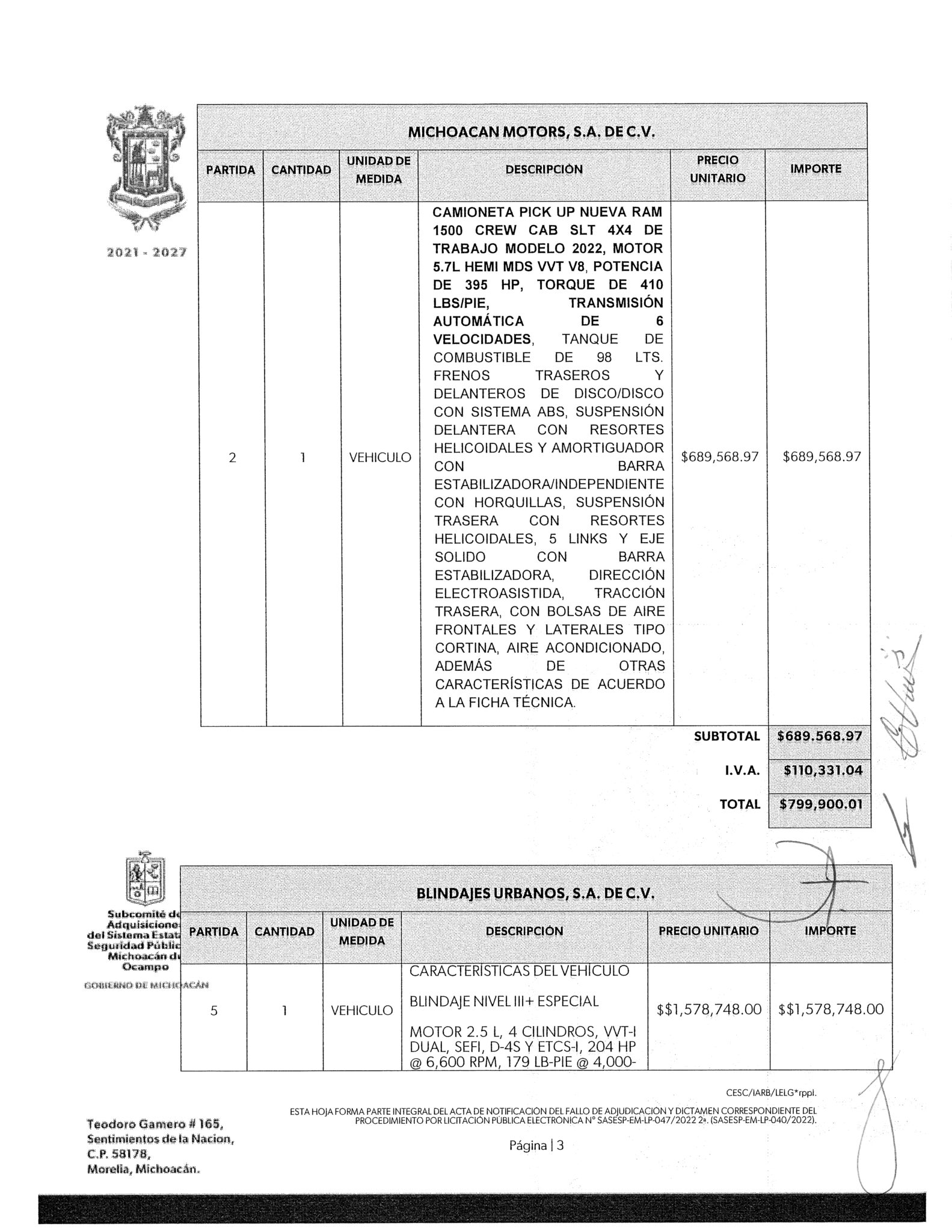 La licitación, cuyo objetivo era: Adquisición de Vehículos y Equipos Terrestres para programas de Seguridad Pública y Nacional, resultó en una adjudicación total (incluyendo I.V.A.) de $2,631,247.69 (dos millones seiscientos treinta y un mil doscientos cuarenta y siete pesos 69/100 M.N.).