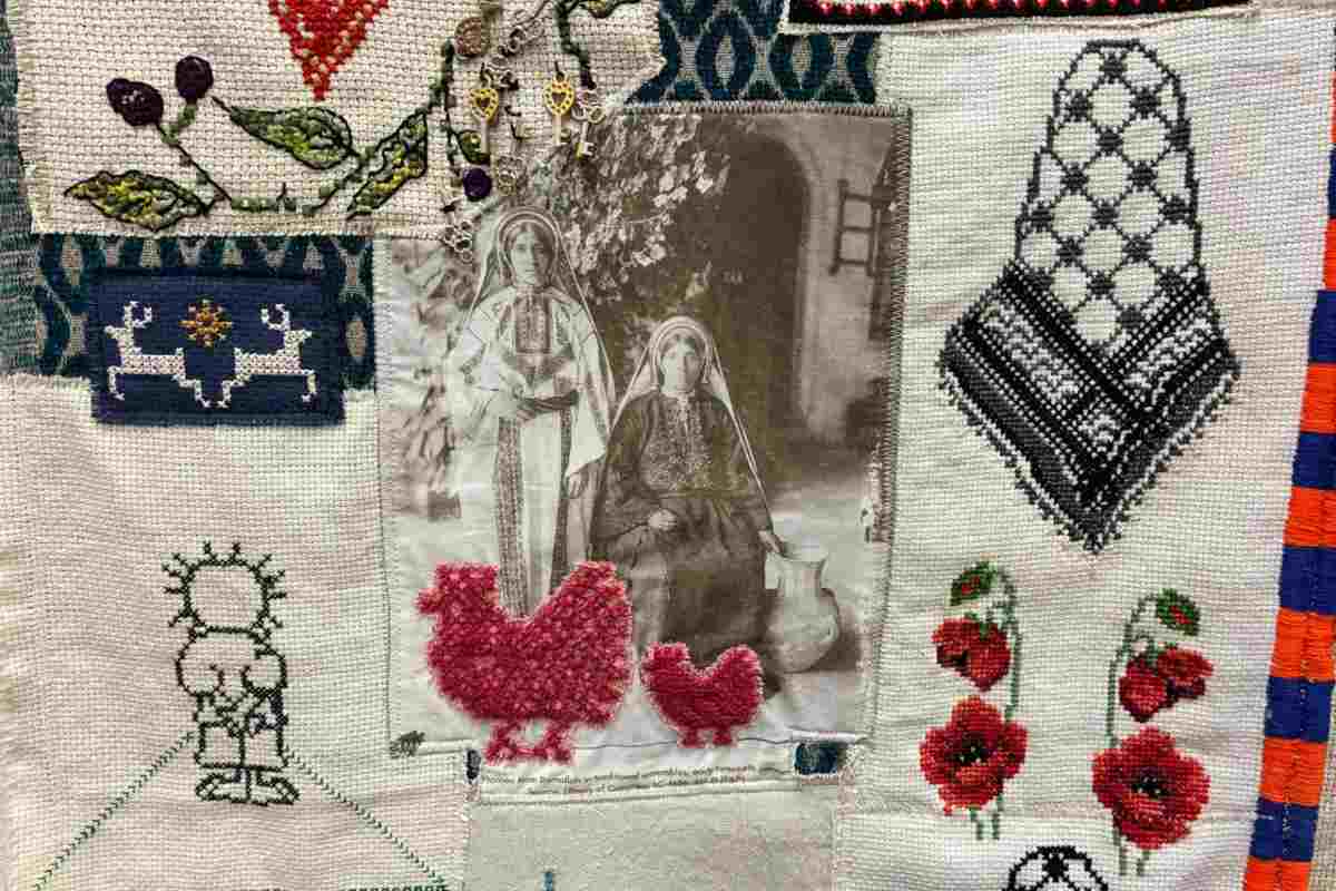 Con este tipo de puntadas, Schmelz comenzó a bordar el patrón de una figura femenina de espaldas, “a la que denominé mujer testigo, porque me parece que las mujeres palestinas atestiguan la historia y han convertido el bordado en un lenguaje de resistencia contra la colonización”.